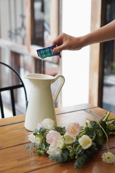 Bước 2: Gỡ lớp giấy bên ngoài, bạn sẽ thấy một gói thuốc dưỡng được buộc ở gần gốc hoa. Đổ thuốc dưỡng vào lọ nước và hoà tan